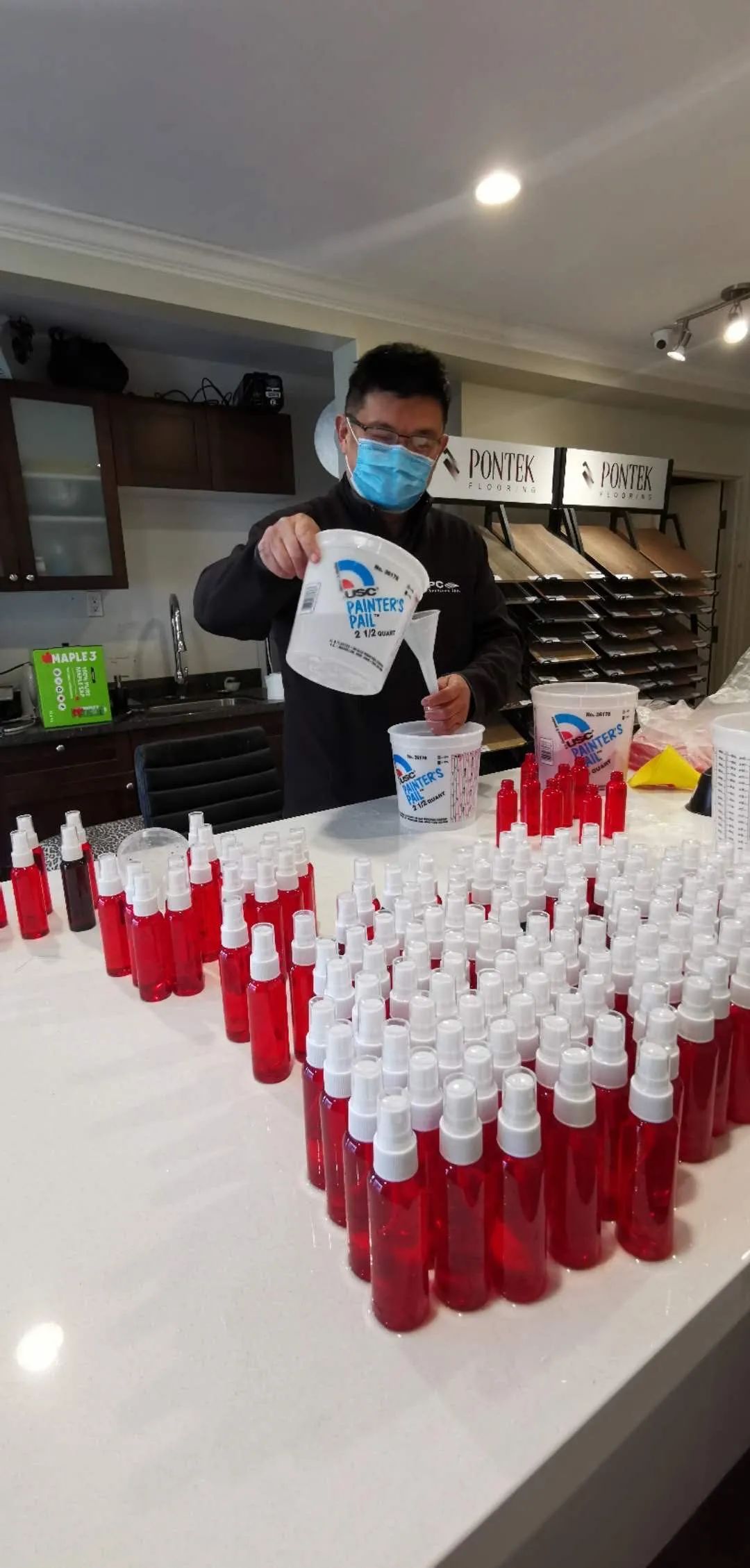 在温哥华有一家经营了十几年,口碑很好的建筑装修公司名叫JPC services inc,主营业务是建筑装修和保险理赔和漏水处理等,公司有自己的一套经营理念,归纳为4S系统:分别是Safety、 Services、Systematized、Sytisfaction。公司负责人蒋浩 Jeff是个众所周知的有责任心、好人缘、热心肠、热衷于工作的人。作为华联会的执行委员之一,Jeff在武汉封城当天收到华联会牛华会长的号召,连夜积极支持筹款,华联会是第一个在本地发起捐款的社团,很快就把10万个口罩及时送给中国的疫区。同时他也通过其它渠道捐了不少抗疫物资回国,包括400副护目镜等等。当加拿大疫情爆发的时候,听说酒精和消毒用品告急,他立刻自己掏腰包给老人院、一线工作人员、警察局和周围的朋友送了随身携带的酒精和消毒液。他还紧急联络了两位老朋友Sunny和马进,与他们一起生产医院急需的防护隔离罩以及防护面罩等,无偿提供给温哥华一线的医护人员,还在爱心人士的帮助下寄给了外省医院。
